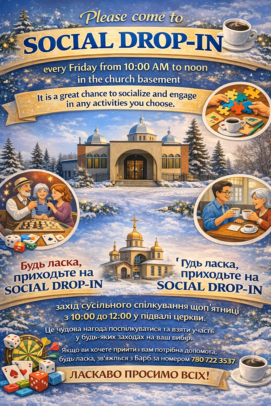 Please come to SOCIAL DROP-IN every Friday from 10:00 AM to noon in the church basement. It is a great chance to socialize and engage in any activities you choose. If you would like to come and need a ride, please contact Barb 780 722 3537. EVERYBODY WELCOME!